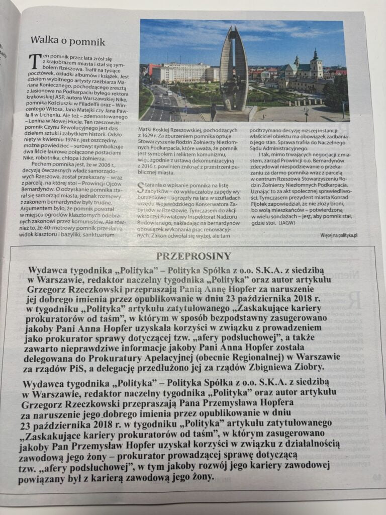 W bieżącym numerze Polityki (nr 26, 19.06 – 25.06.2024) na stronie 8 opublikowano przeprosiny w związku z naruszeniem dobrego imienia osób opisywanych w nierzetelnych materiałach prasowych.